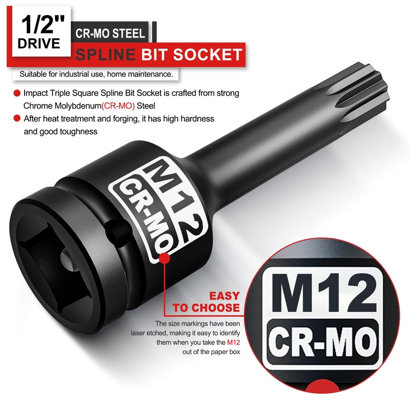 - Material: Impact Triple Square Spline Bit Socket is crafted from strong Chrome Molybdenum(CR-MO) Steel. After heat treatment and forging, it has high hardness and good toughness