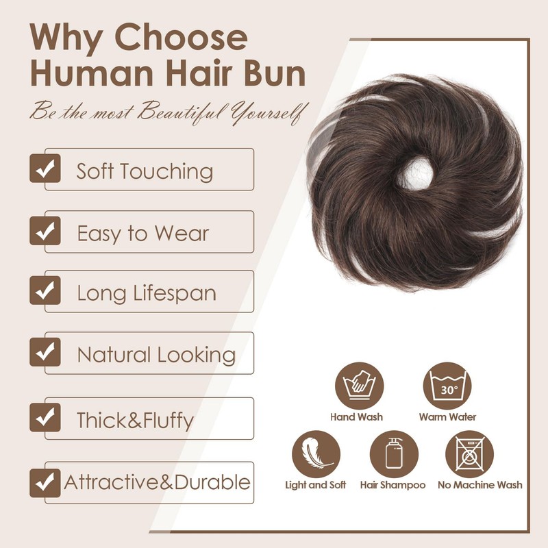 - 【Salon Quality Hair Bun】100% premium remy human hair, salon quality, tangle free. The hair feel smooth and soft. our human hair bun extension can be curled just you like.