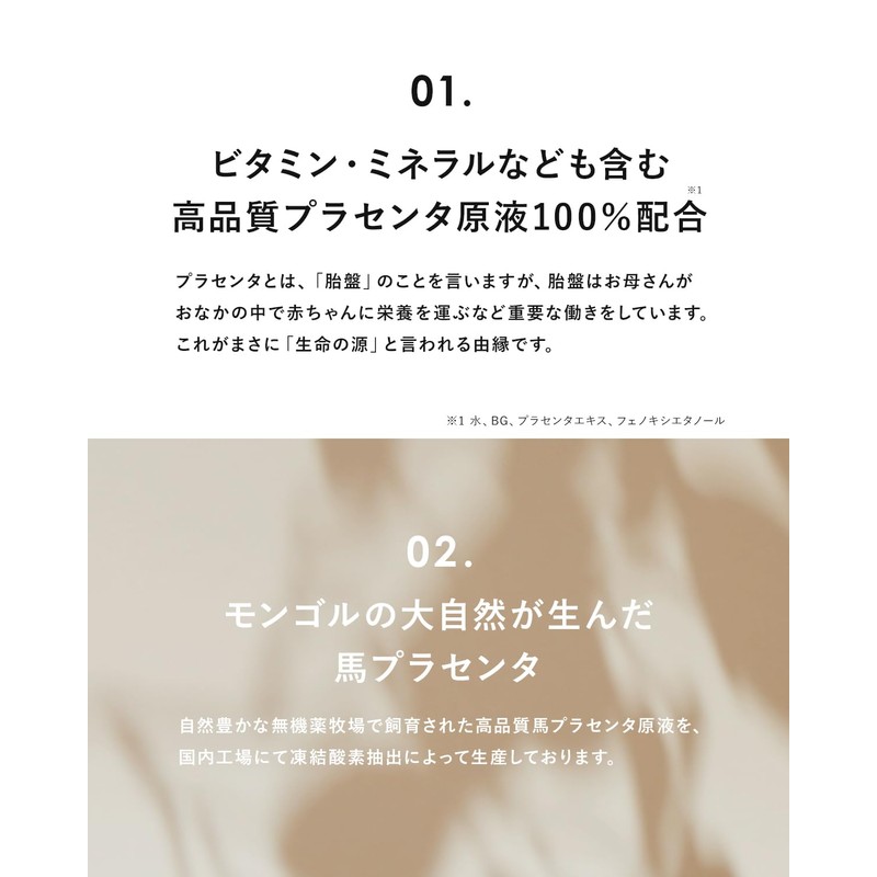 - Nutritious Horse Placenta: High quality horse placenta solution 100% (*1) formula. > Placenta refers to "placenta", but placenta is an important job such as carrying nutrients to the baby in the stomach. This is exactly what we say is the source of life. 1 water, BG, placenta extract, phenoxyethanol