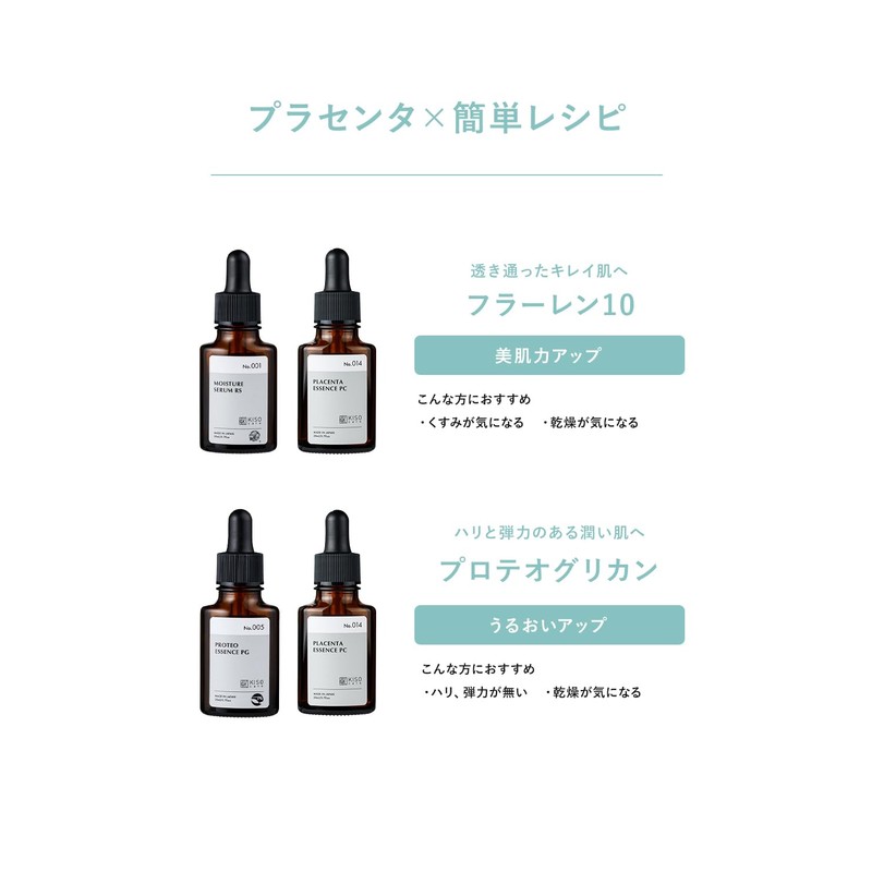 - (Solution (*3) A firm and thick feeling of use: While most placentas are usually made with a smooth or thickening agent, KISO is 100% (*1). The thick taper is evidence that the polysaccharide (hyaluronic acid and chondroitin), one of the nutrients in placenta. 1 water, BG, placenta extract, phenoxyethanol