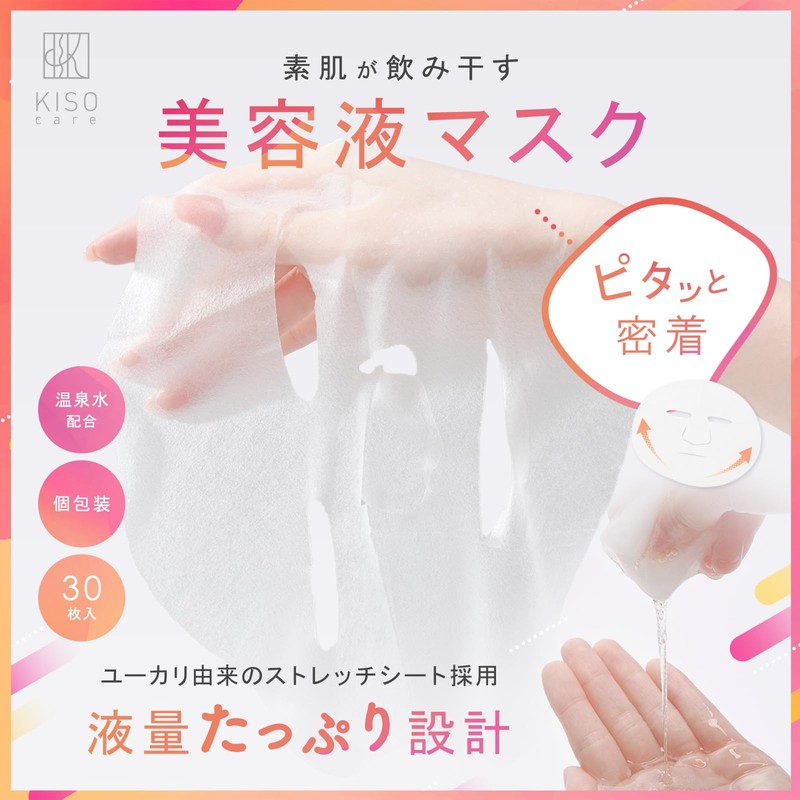 【KisoCare プレミアムフェイスマスク】 「1枚で完結する贅沢なオールインワンケア」 美容液がたっぷりと染み込んだ大容量フェイスマスクが、あなたのスキンケアを革新します。とろみのあるジェル状美容液が肌の奥深くまでなじみ、マスクを外した後もしっとりとした使用感が長時間続きます。ぷるぷるとしたテクスチャーの美容成分が1枚ずつ贅沢に染み込み、肌に吸い付くような心地よい感触を実現しました。 化粧水・美容液・乳液・クリームの機能を1枚に凝縮したオールインワン設計により、忙しい毎日のスキンケアタイムを劇的に効率化します。複数のスキンケアアイテムを重ねる手間を省き、たった1枚で本格的な保湿ケアが完了。忙しい平日は短時間でのケア、週末はゆっくりとしたケアと、ライフスタイルに合わせて自由にお使いいただけます。 「独自技術による特殊シート設計」 ユーカリから抽出した繊維を独自技術で加工した特殊シートを採用。透けるような薄さの極薄設計でありながら、肌の凹凸に沿って完全密着し、美容成分の浸透感を大幅に向上させました。この革新的な密着技術により、顔を下に向けても剥がれにくく、家事をしながら、読書をしながら、ドライヤーを使いながらでも快適にケアできます。 お客様からのご要望にお応えし、従来品よりも大きなサイズ設計と保護シートを新たに採用いたしました。顔全体をしっかりとカバーできるサイズにより、美容成分をお肌全体に行き渡らせることができます。台紙付きの設計により、マスクの取り出しや装着時のストレスを軽減し、目元・口元の穴部分の伸びや破れを防ぎ、美しい形状を保ったまま快適にお使いいただけます。 「肌にやさしい7つの無添加処方」 KisoCareが厳選した7つの無添加処方を採用し、パラベン、鉱物油、エタノール、合成香料、合成着色料、紫外線吸収剤、シリコンを使用していません。デリケートなお肌の方にもお使いいただけるよう配慮したやさしい処方設計で、敏感肌の方や肌トラブルが気になる方にもお試しいただけます。 高保湿処方により、お肌にたっぷりとうるおいを与え、しっとりとした使用感をお楽しみいただけます。毎日のスキンケアステップを簡素化しながら、必要な保湿ケアはしっかりと実現する、現代のライフスタイルに寄り添ったフェイスマスクです。 「天然温泉の恵みでリラックス体験」 紀伊山地の深い森林に育まれた天然ラドン温泉由来成分を配合し、自然由来のアロマの香りとともに、自宅にいながら温泉のような心地よいリラックスタイムをお過ごしいただけます。豊富な美容液成分との相乗効果により、お肌にうるおいとなめらかさを与え、温泉上がりのようなしっとりとした使用感を実現します。 慌ただしい毎日の中で、わずか10分間の特別なひとときを。マスクを肌にのせた瞬間から広がる温泉地特有の心地よい香りが、日頃の疲れを癒し、心身ともにリフレッシュできる贅沢なスキンケアタイムをご提供します。天然温泉の恵みを凝縮した特別処方により、お肌本来の美しさを引き出すサポートをいたします。 「お客様と共に進化する製品づくり」 「もっと大きいサイズがほしい」「取り出しやすくしてほしい」といったお客様の貴重なお声を製品開発に活かし、継続的な品質改善に取り組んでおります。お客様にご愛用いただいているKisoCareならではの高密着技術はそのままに、使い勝手の向上を図りました。お客様とともに育てていく製品づくりをコンセプトに、より良いスキンケア体験をお届けできるよう努めています。 多忙な現代女性のために設計された、本格エイジングケアがながらケアで叶うフェイスマスクです。もちろん、仕事や外出で疲れた肌をリフレッシュしたい男性にもおすすめです。忙しい現代人のための、プライベート温泉体験をお楽しみください。