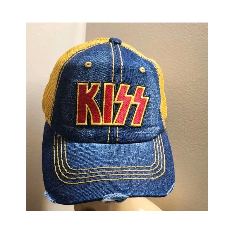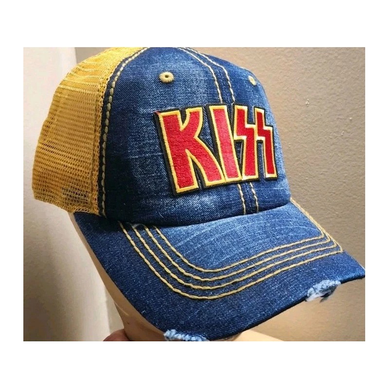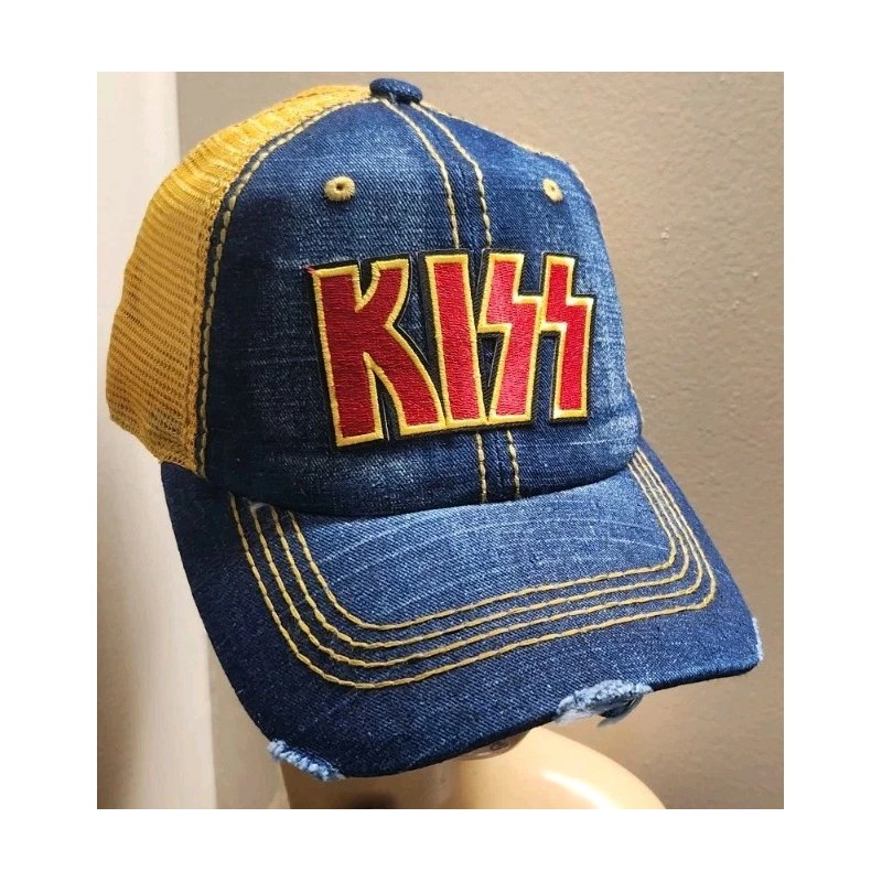 Kiss Hat Distressed Ball Cap Hat Denim & Wheat Mesh Hat
