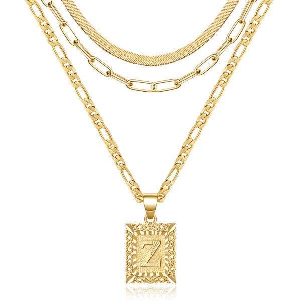 KissYan Gold Layered Necklace Set for Womens, 14K Gold Plated Initial Letter Pendant Necklace Paperclip Snake Choker Silver Alphabets from A-Z Figaro Chain Necklace Jewelry Gift (Gold Z)