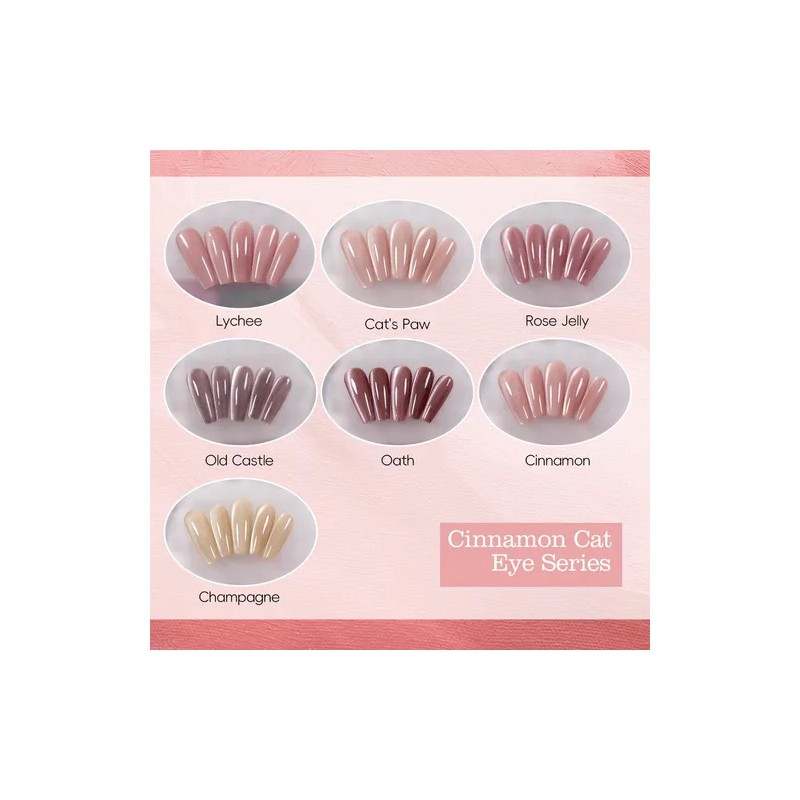 Características principales Marca Adhere Modelo Cinnamon Cat Eye Series Línea Gel Semipermanente Volumen de la unidad 12 mL Otros Tipo de esmalte Gel Cat Eye Acabado Semipermante Es secado rápido Sí Es libre de crueldad Sí