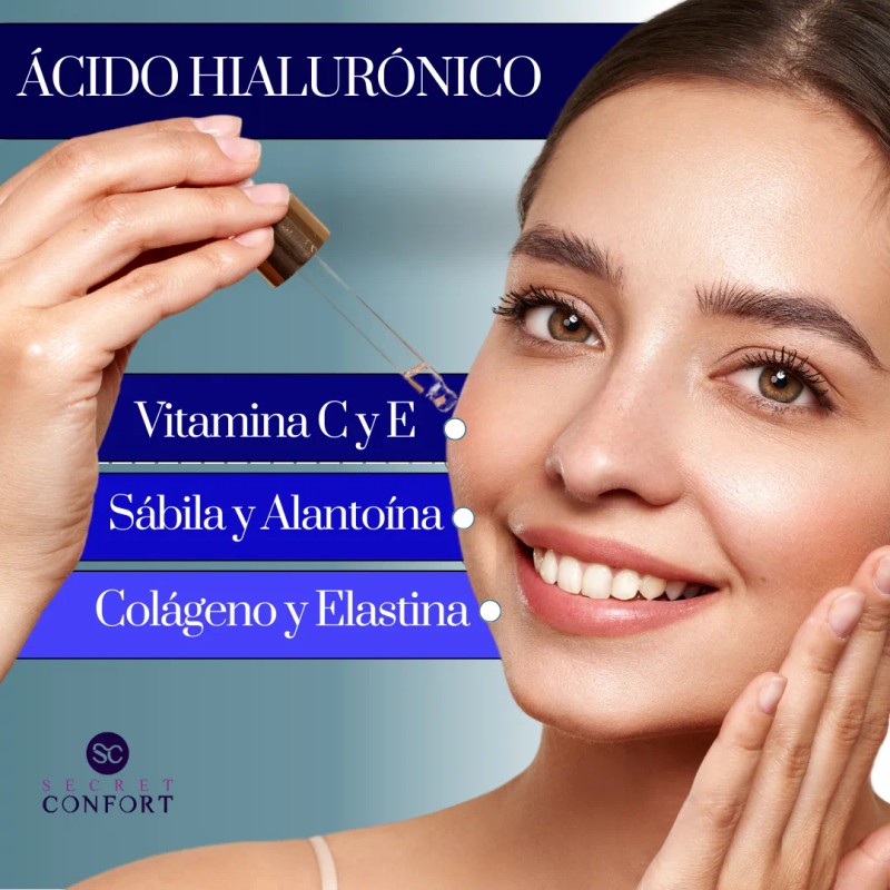 Además, el Ácido Hialurónico con VITAMINA C y E es un elixir mágico para tu piel. Cada gota es un festín de hidratación que revitaliza tu rostro, desvaneciendo líneas de expresión y unificando el tono de tu piel. Con la poderosa combinación de alantoína, colágeno, elastina y sábila, ¡tu piel lucirá más joven y radiante que nunca! 💧✨