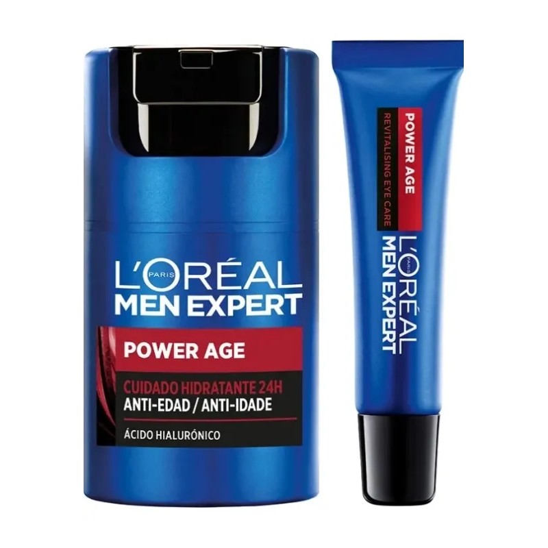 Kit L'Oréal Men Expert Power Age el nuevo cuidado hidratante 24h antiedad mejorado con ácido hialurónico que alisa arrugas, hidrata intensamente y reafirma tu piel para combatir los signos de la edad. Tiene una textura no grasa y es de fácil absorción.