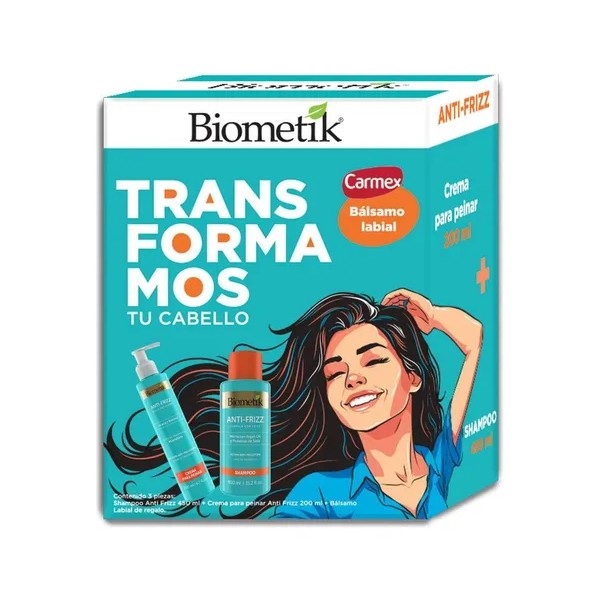 Transforma tu rutina de cuidado capilar con el Kit Biometik Anti Frizz, diseñado especialmente para cabellos con frizz, crespos y ondulados. Este shampoo y crema para peinar brinda limpieza y facilita el peinado, mejorando la manejabilidad de tu cabello, dejándolo suave y sedoso. La fórmula avanzada penetra en la fibra capilar, ayudando a controlar el frizz y proporcionando un acabado brillante.