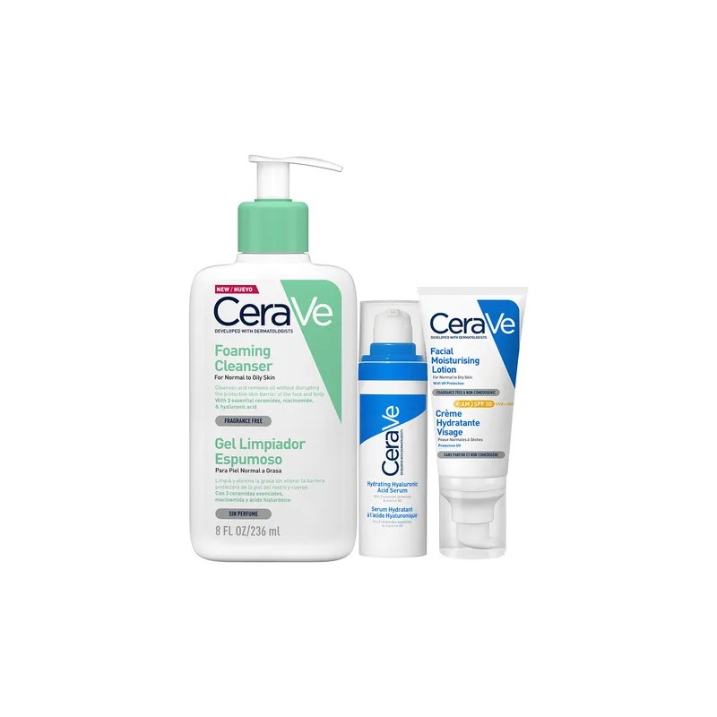 El Kit CeraVe Rutina Facial incluye: Un Gel Limpiador Espumoso 8oz, un Sérum Hidratante con Ácido Hialurónico y una Loción Hidratante de Rostro FPS30.