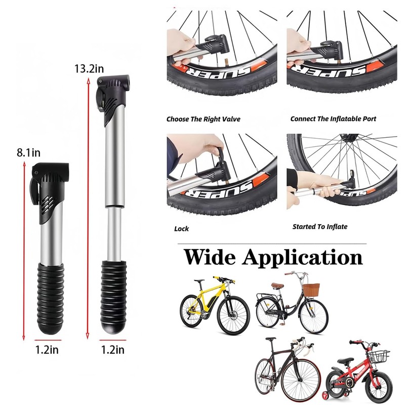 - Mini bomba de bicicleta: la bomba de aire es resistente y duradera hecha de acero inoxidable y plástico. Con un diseño compacto, solo mide 20,5 cm de largo, es fácil de transportar y puede caber en la mayoría de bolsas de bicicleta. Puedes bombear fácilmente diferentes bicicletas en la carretera
