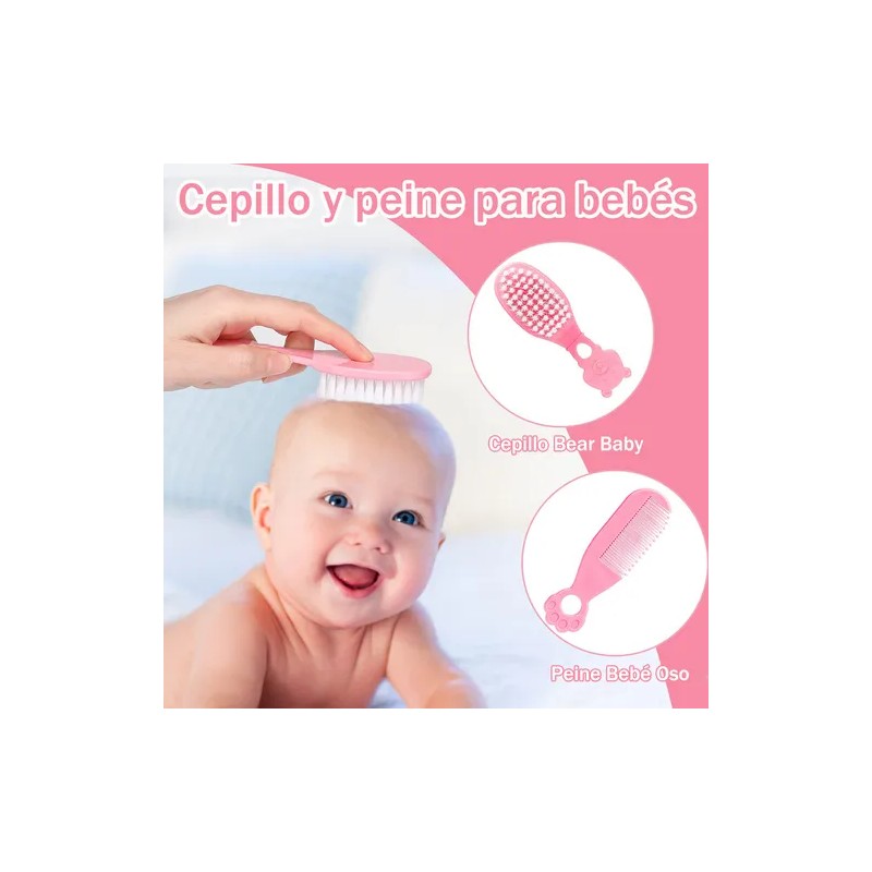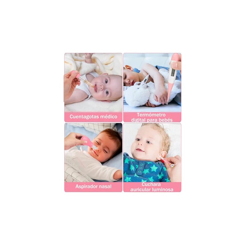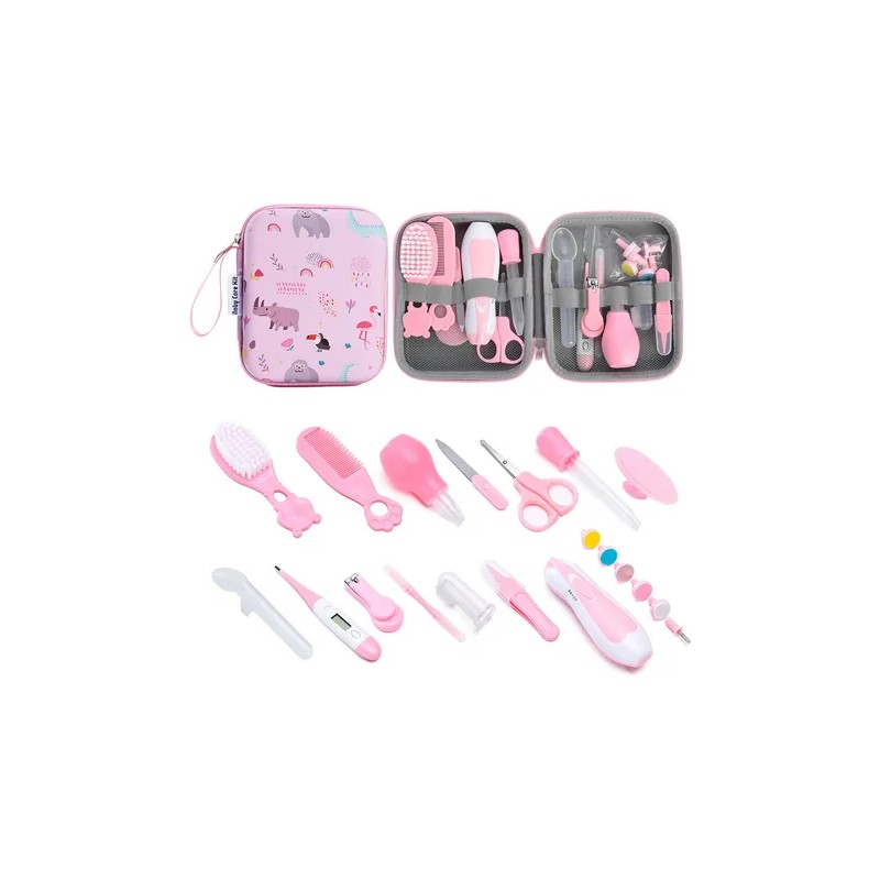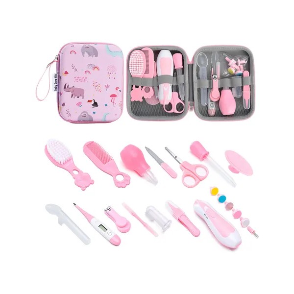 Incluye un conjunto de cepillo de bebé, peine del bebé, termómetro digital, clip de chupete, cortaúñas, lima de uñas, aspirador nasal, tijeras redondeadas de seguridad, cepillo de dientes, pinzas, gotero medicamento, cuchara oído led y bolsa de transporte. Tiene lo esencial que pueda necesitar para el cuidado de su bebé recién nacido.