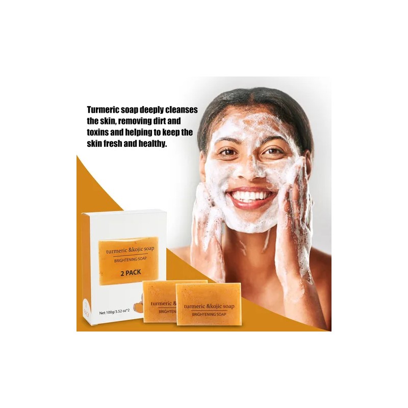 Descripción Limpia: El jabón kójico de cúrcuma limpia suavemente el rostro, desvanece las manchas, ilumina la piel, hidrata y unifica la piel. Descripción