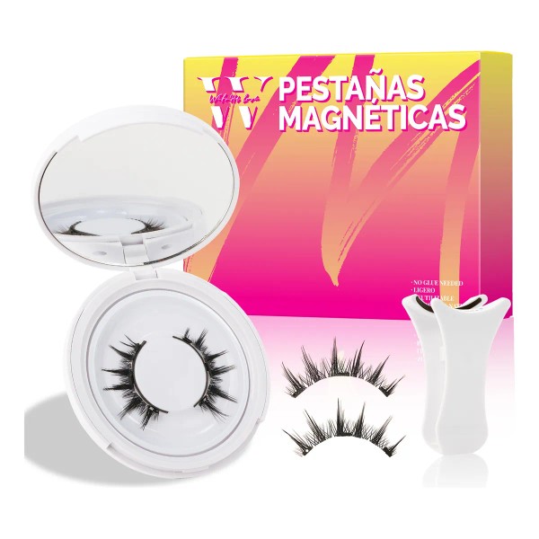 A: Las pestañas magnéticas tienen pequeños imanes en la base. Usa la herramienta aplicadora para colocar la tira superior e inferior de manera que los imanes se atraigan, sujetando tus pestañas naturales sin necesidad de pegamento.