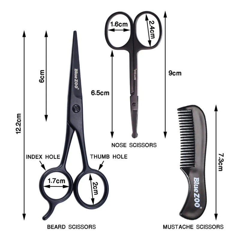 Viene con un par de cortas barbas; Un par de tijeras de punta corta con punta de seguridad redondeada, un peine para bigote portátil y una bolsa portátil.