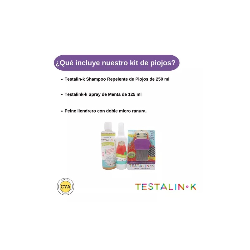 Incluye shampoo Testalin-K de 250ml, peine liendrera con doble micro ranura y repelente en spray de 125ml.