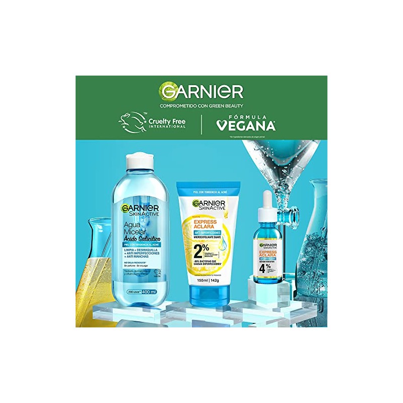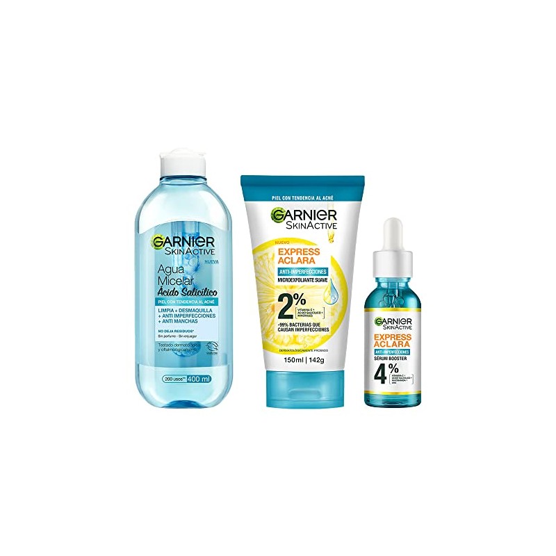 Kit Garnier Rutina Express Aclara Anti Acn 3 pasos, Agua Micelar con Acido Saliclico 400ml Micro Exfoliante Sueva Anti Acn 150ml Serum Booster Anti