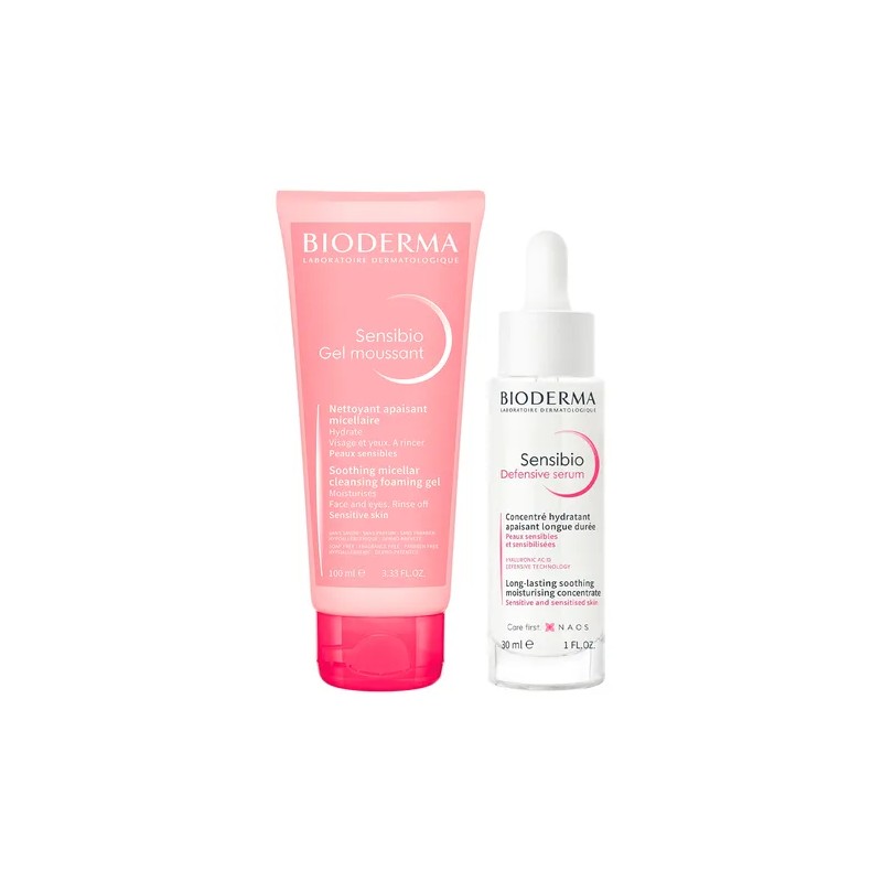 Este kit de Rutina Calmante Sensibio Gel Moussant y Sensibio Defensive Serum, ofrece una limpieza suave que calma y reduce irritación con Sensibio Gel Moussant. Previene, alisa líneas de expresión e hidrata la piel sensible con Sensibio Defensive Serum. Es una rutina completa en dos pasos para una piel calmada e hidratada. Bioderma te acompaña con este kit de la gama Sensibio que reduce las rojeces y devuelve la confianza, asegurando un cuidado delicado y efectivo.