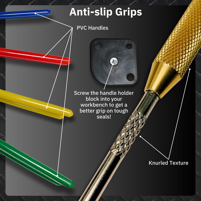 - Also includes a plastic block handle holder you can screw into your work bench for help on tough seals.