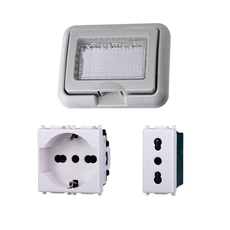 • Note: The sockets and switches are included in the kit, compatible with Vimar Plana. Valid for 1 set with plate Idrobox IP55 pre-assembled, Schuko socket P40 + bypass socket 10/16 A, colour: white