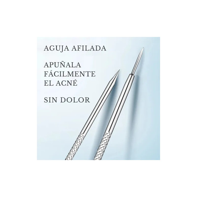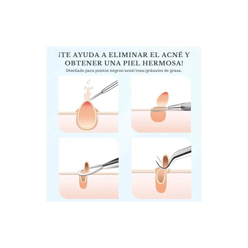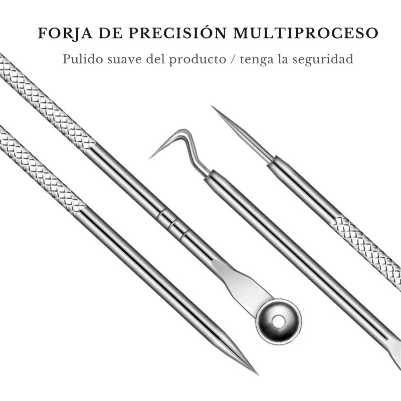Cada herramienta está diseñada ergonómicamente para ayudarte a eliminar de forma eficiente puntos negros, espinillas, granitos, barros, comedones y hasta vellos encarnados, sin maltratar la piel ni dejar marcas innecesarias.