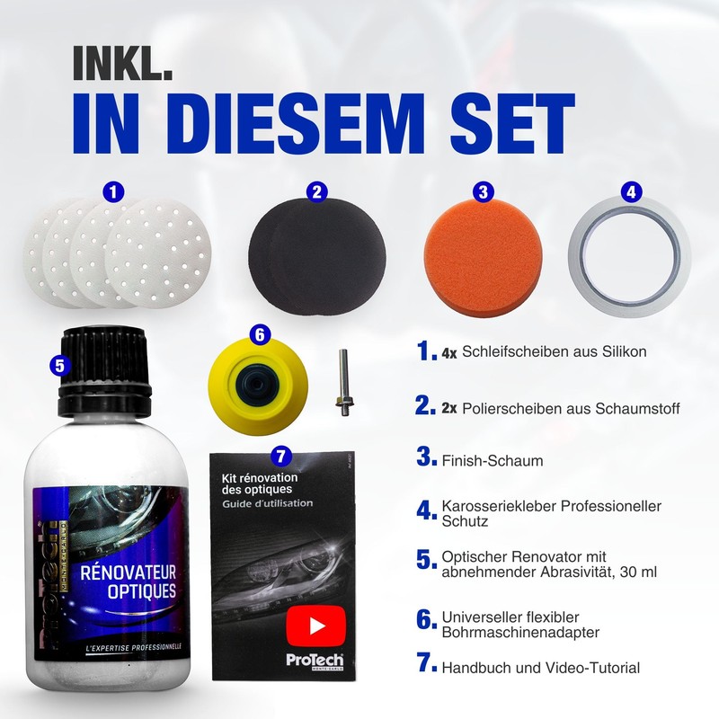 - Headlight Renovation Kit Contents This all-in-one kit has been developed by our experts in car repair and protection and includes everything you need for a simple and effective renovation. It contains: 1 bottle of headlight renovator (30 ml); 1 universal adapter for drills; 4 sanding discs (grit P800); 2 "thick" polishing discs (grain P2000); 1 foam; 1 roll of protective tape (25 m); 1 instruction manual (*drill not included).