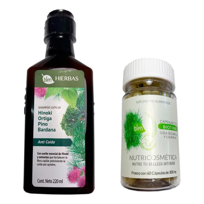 El Kit Blen Anticaída combina el poder externo del shampoo con extracto de Hinoki (ciprés japonés) y el apoyo nutricional de cápsulas con biotina y otras vitaminas esenciales, ofreciendo un tratamiento completo contra la caída del cabello.