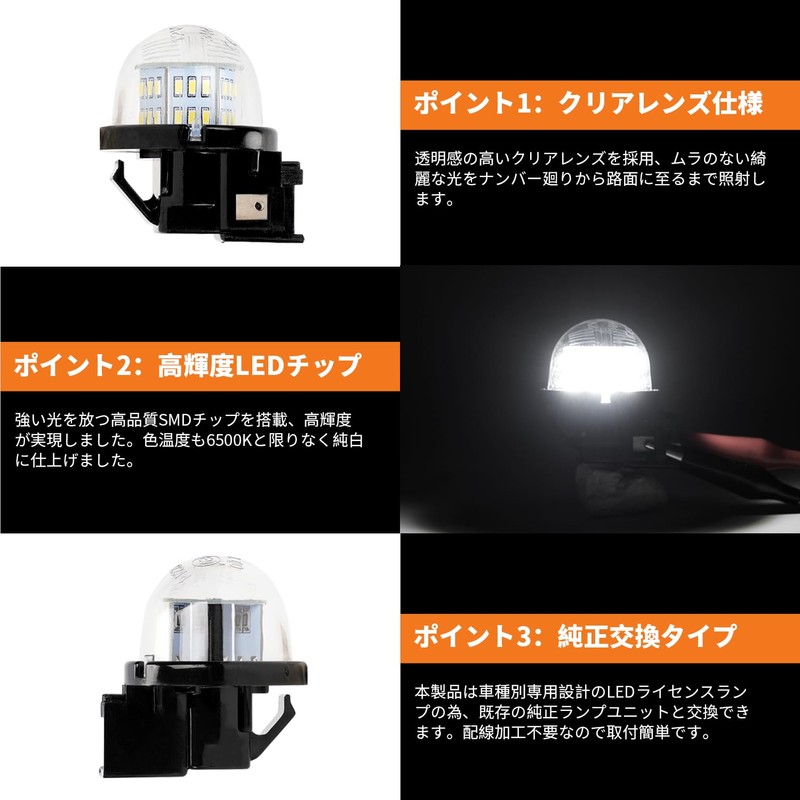 - (High Brightness & Pure White Lighting) Adopts a high brightness LED SMD chip that increases the attention of subsequent cars and brightens up the number area with a clear brightness. It achieves a pure white shine that is not achieved by halogen products