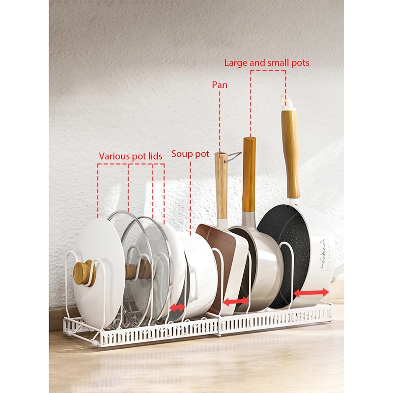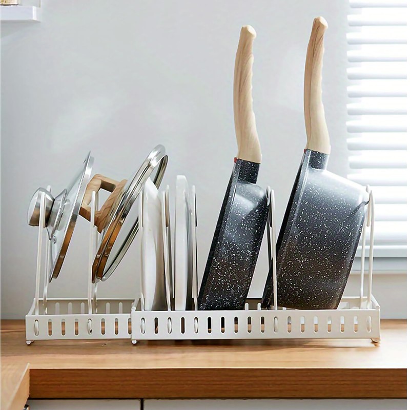 - Innovative Pot Holder: This dish and pans lid organizer rack shelf is perfect for storing large kitchen items such as pots, pans, cutting boards, serving plates, and pot lids. The rotating drainage outlet facilitates easy water drainage into the sink