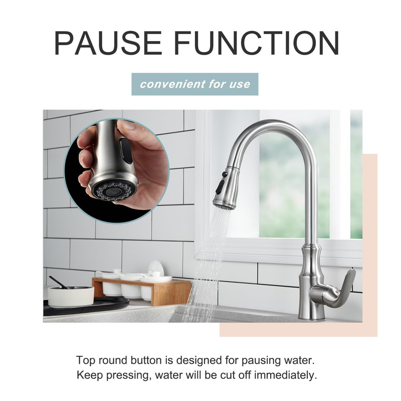 - CONVENIENT BUTTON SWITCHING, simply press and release the button to switch from stream to spray mode. Keep pressing the round button will pause the water immediately, help save water