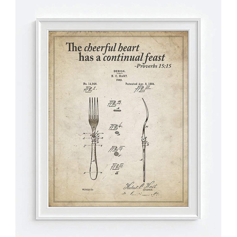 Kitchen Patent Bible Verse Christian Wall Art Prints, Set of 4, Unframed, Vintage Kitchen Photo Prints, John 6:35, Lamentations 3:23, Proverbs 15:15, Psalm 37:4, 8x10