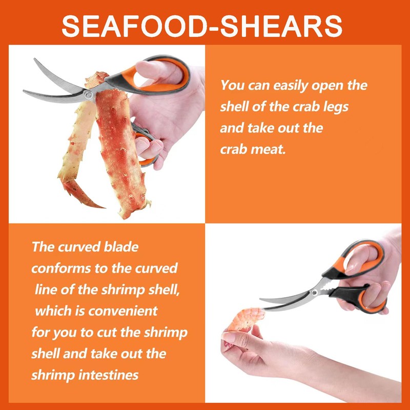 - 【Professional Seafood Scissors】 Shrimp Scissors are lightweight and easy to grip - The handle is made of PP material and weighs only 0.47kg (0.106lb). The curved blades fit the contours of the shrimp's back, with micro-serrated teeth for a better grip on food, able to easily crack and cut crabs, shrimp, lobster, crayfish and other types of seafood. Definitely one of the must-have kitchen scissors.