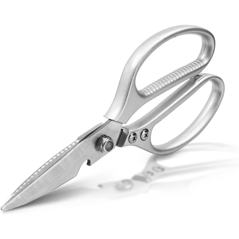 - 【MULTI-FUNCTION KITCHEN SCISSORS】 Performing well in the kitchen, such as cutting raw meat, chicken, poultry bones, vegetables, pizza, herbs, bottle opener, it is also used well daily: cutting card-boards, papers, hard plastic of product boxes, trimming flower stems. This kitchen scissor is designed for any heavy duty. After easy disassembling the shears, it can peel fruits and potatoes and scrape fish scales, our scissors are a good helper for your kitchen