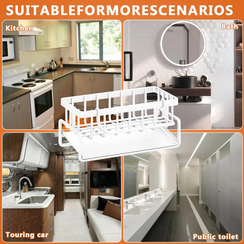 - 【Multifunctional Sink Organizer】 Sink caddy allowing flexible placement of sponges, dish soap, soap dispensers, brushes, sink plugs and a hanging rod for hanging dish cloths,drainage channels can send water directly into the sink.Our sink organizer is versatile , can be used not only for kitchen but for restroom and bathroom to get rid of clutter.