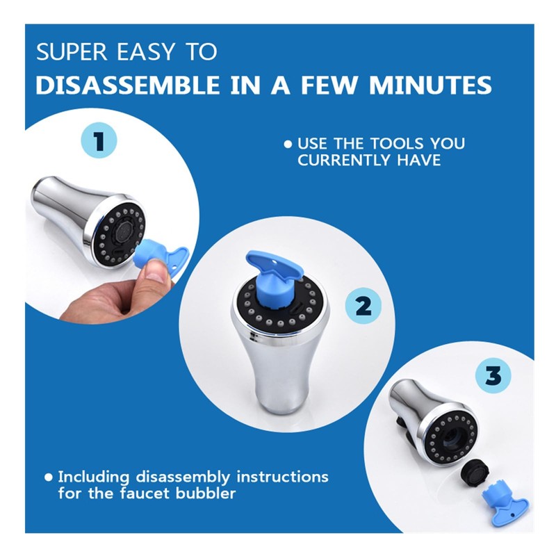 The kitchen faucet nozzle replacement comes with a uniquely designed high-pressure flush mode, a very powerful power mode that makes it easy to flush food scraps with blade water. Just press and release the button to switch between the 3 modes.