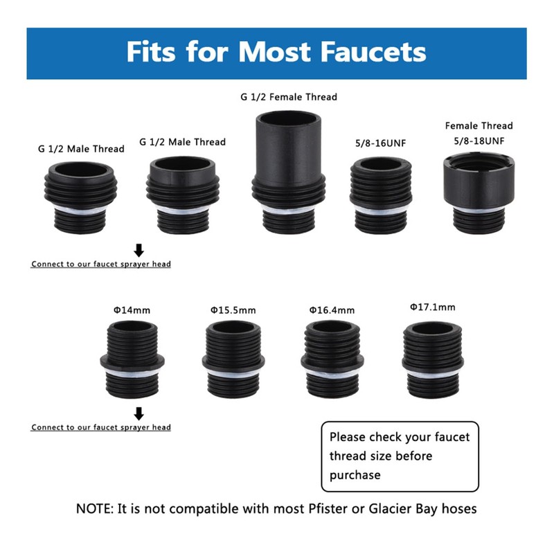 • Universal 9 adapters: Polished Chrome kitchen sink faucet heads come with 9 adapters that are compatible with most types of faucets from American Standard faucets, are suitable for standard types of pull-out hoses, are suitable for most applications, but not for some specific models, check your dimensional thread type.