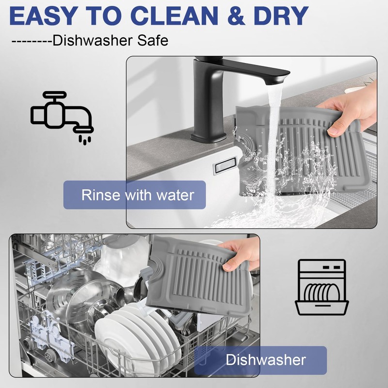 - 💦【High Quality Silicone & Durability】Crafted from high-quality silicone, our faucet guard and draining mat is built to last. The reinforced back design prevents collapsing in the middle, ensuring robust support for heavier items. Its sloped surface facilitates easy water drainage, while the foldable design allows for convenient storage when not in use.