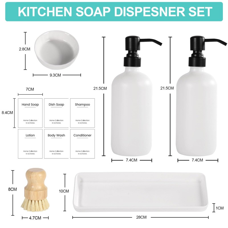 - 【HAND SOAP AND DISH SOAP DISPENSER SET WITH CERAMIC TRAY】This farmhouse kitchen accessories set would make a surprising difference in your kitchen. The package includes two 16oz dish soap dispenser, ceramic base, ceramic soap tray, 6 Waterproof Labels and a bamboo dish brush. And the bamboo dish brush would make your dishwashing job much easier and more convenient, meet your daily multiple needs.