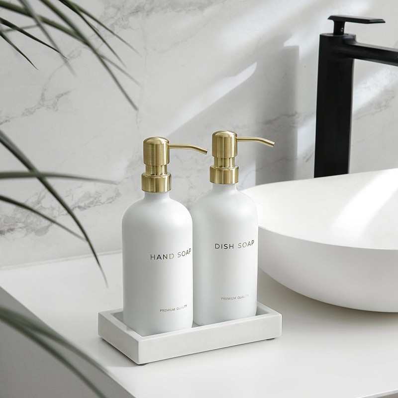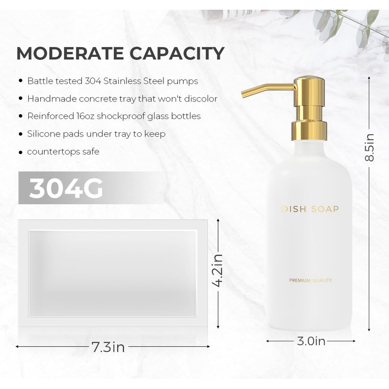 - LUXURY SOAP DISPENSER SET -This set includes two 16.9 oz premium glass bottles with 2CC stainless steel pumps, one hand-made concrete trays.