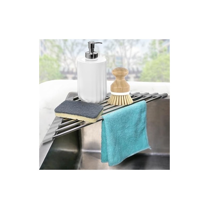• EASY STORAGE CORNER DISH DRYING RACK: With roll-up design this kitchen sink sponge holder is easy to fold and put away. Just unfold it and use as a kitchen utensil holder, a bottle dying rack, a sink strainer when doing cleaning tasks under the tap, and store corner sink rack under the sink or in cabinet when not in use. This sink organizer rack for kitchen also works well as a kitchen counter decor making your kitchen look organized and clean.