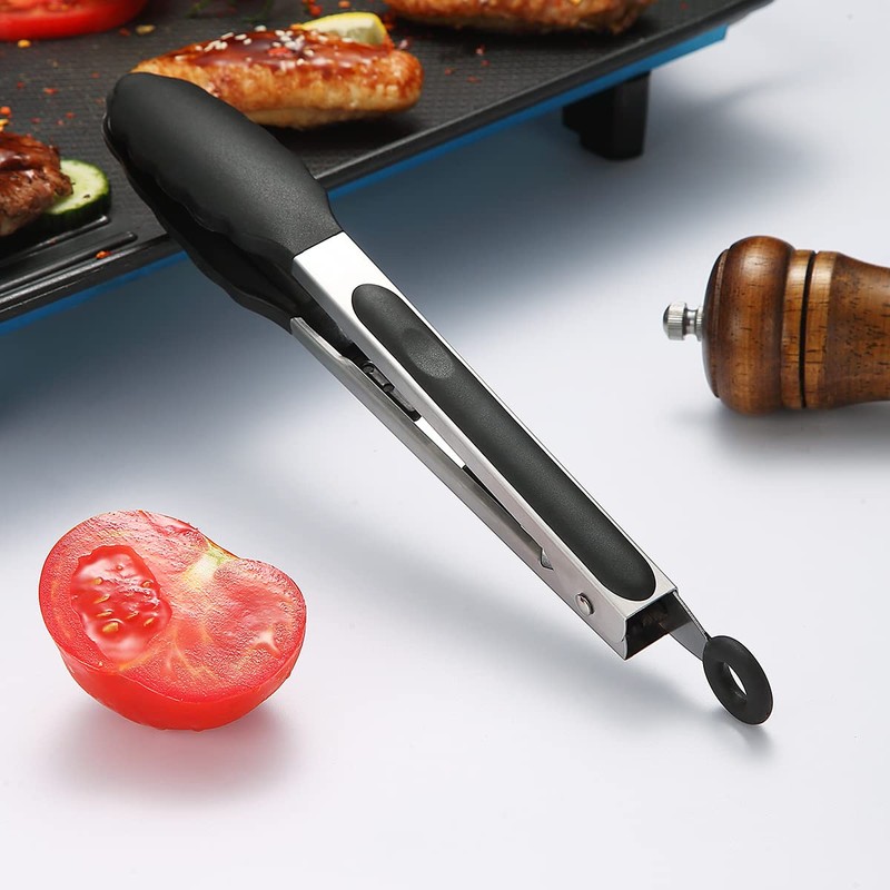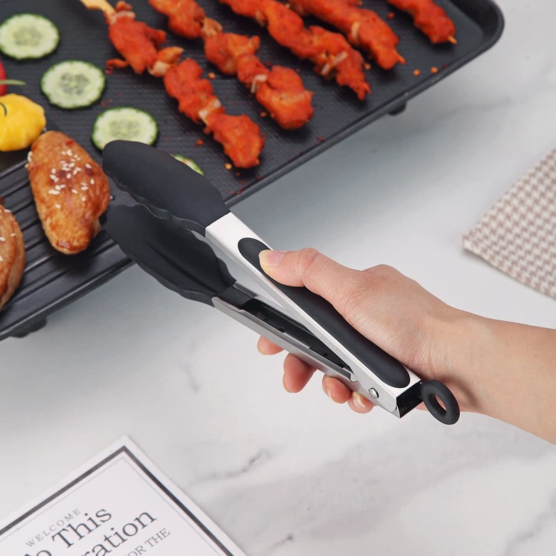 - The 1 piece 9 inch kitchen tong make it easier for you to grill, and long handles to keep you safe from fire Source for a relaxing and enjoyable BBQ, food grade silicone is BPA free, non-toxic and tasteless, so you can use this kitchen tong to make delicious food with confidence.