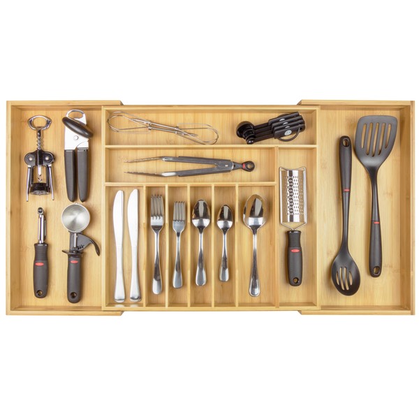 This patent-pending deluxe bamboo kitchen drawer organizer for silverware, flatware and utensils is designed and sold exclusively by KitchenEdge. Our unique design easily adjusts to fit extra-large kitchen drawers up to 33" wide. This organizer will fit inside standard-depth 18" (front to back) drawers. ORDER WITH CONFIDENCE: We guarantee that your organizer will arrive safely to your home or your money back! We include 7 levels of packaging protection: (1) a silica gel pack to absorb any humidity inside the (2) shrink wrap encasing the organizer, inside (3) a layer of bubble wrap, inside (4) another layer of bubble wrap (yes, 2 layers), inside (5) an inner corrugated cardboard box, surrounded by (6) packing paper, all encased in (7) an outer corrugated cardboard shipping box. SATISFACTION GUARANTEE: If you are not completely satisfied with your purchase for any reason, simply return it within 30 days for a full refund. MANUFACTURER WARRANTY: We are so confident in the craftsmanship of our organizers, that we offer a 6 month warranty against manufacturing defects. Please Note: Flatware and other items in product photos are not included with purchase. By KitchenEdge – Innovative design. Superior quality.