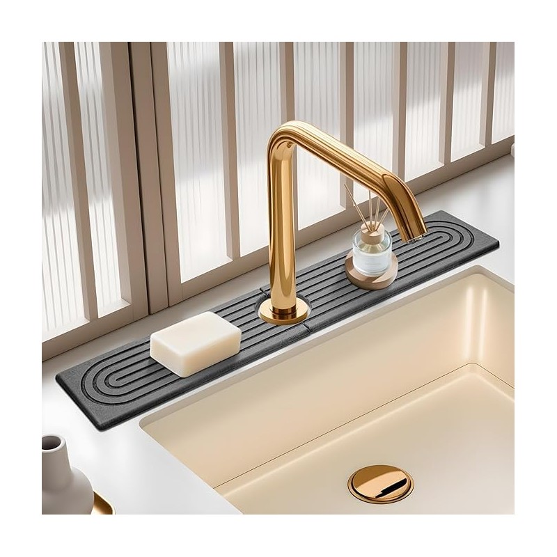 - Check out this diatomite faucet mat - it soaks up water crazy fast! Spills disappear in minutes, leaving your sink area dry with no annoying drips. A total must-have for any kitchen!