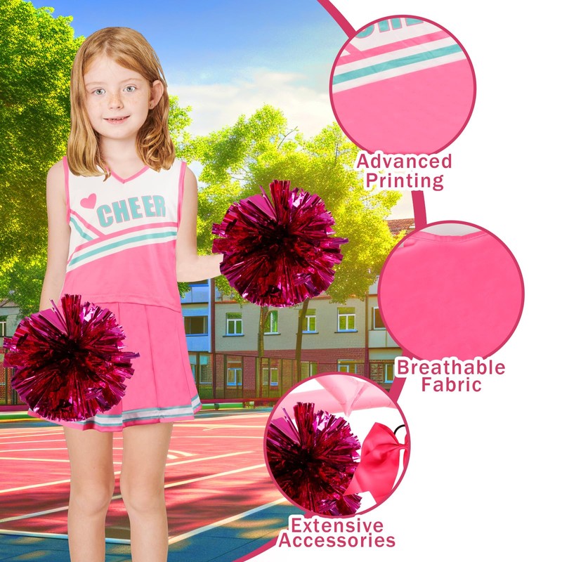 - Cheerleader costume set: this cheerleader costume set for girls includes: cheerleader crop tops, skirt, pom poms, cheer sticks and hair tie. The colours of the entire accessory are perfectly matched to the costume. The gorgeous color scheme transforms your daughter into a confident and adorable cheerleader in no time.