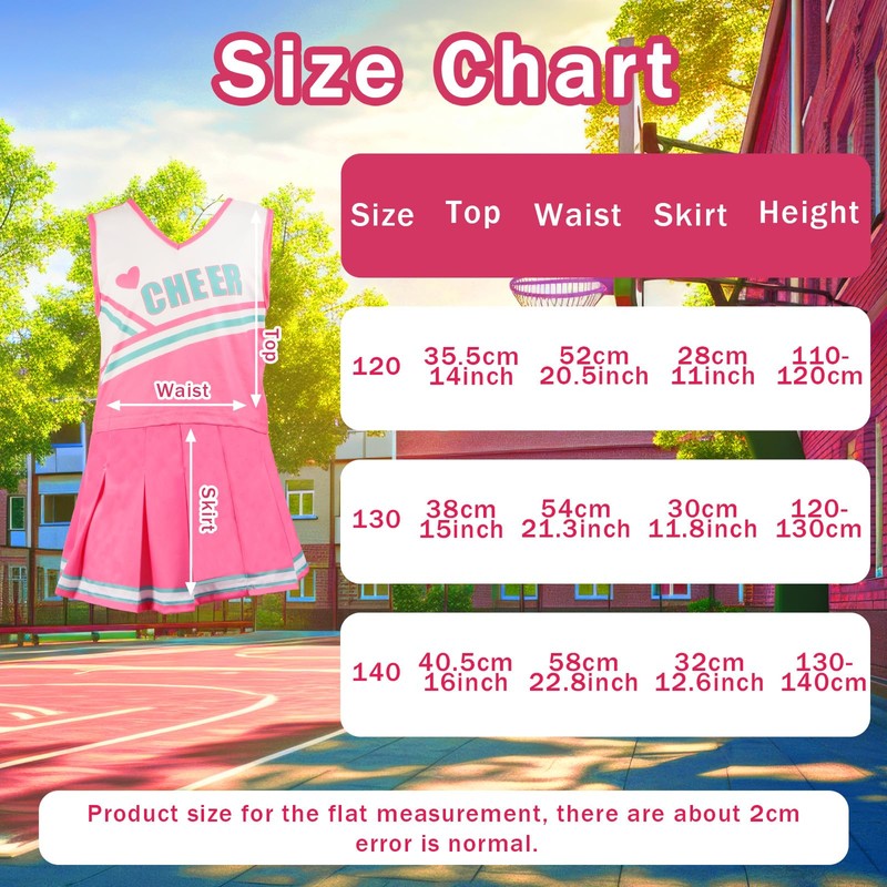 - Sizes and colours: this pink cheerleader costume set for girls is available in 3 sizes (120, 130, 140). The sizes correspond to a height of 110 cm-120 cm, 120 cm-130 cm and 130 cm-140 cm. The size chart also gives specific parameters, please check the data before purchasing to ensure the fit.