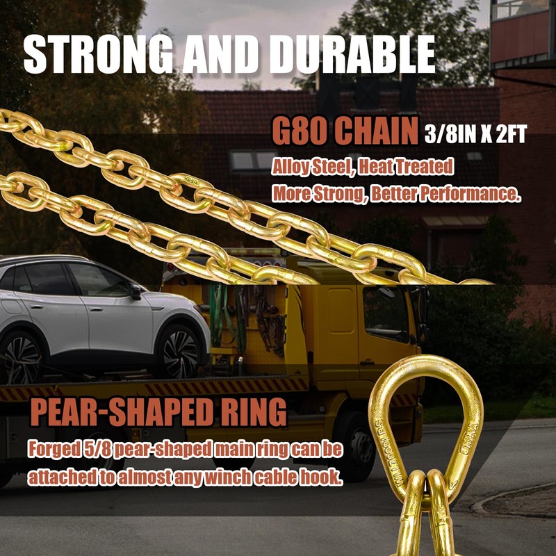 KITUYOTO V-Bridle Grade 80 Chain | 3/8In x 2Ft Towing Chain Bridle with J Hooks and Grab Hooks | Tow Truck Chains | Bridle Transport Chain with 7,100LBS Safe Working Load | for Flatbed Truck