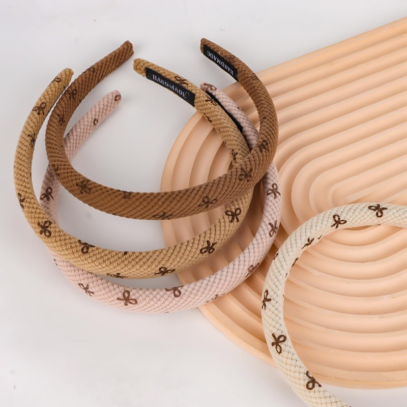 Elevate your everyday style with our bow print knitted headbands for ladies girls. This set includes four thin padded headbands in versatile colours – deep brown, khaki, white, and pink – perfect for mixing and matching with different outfits. Each headband features a charming bow print design that adds a playful yet sophisticated touch to your look. The prints are carefully applied to ensure they remain vibrant and intact even after repeated use.