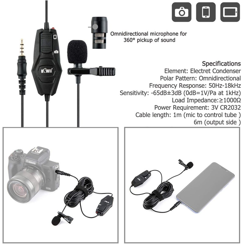 KIWIFOTOS Omnidirectional Lavalier Microphone is specially designed for cameras, camcorders, computers, zoom recorders, smartphones, laptops and tablets.