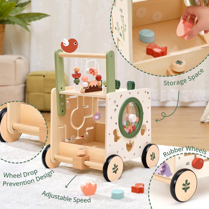 KizKnows Wooden Baby Push Walker, 6-in-1 Montessori Activity Center for Toddlers, Adjustable Speed Dinosaur Walker with Brake & Shape Sorter, Natural Solid Wood Learning Toy for Boys Girls 12M+
