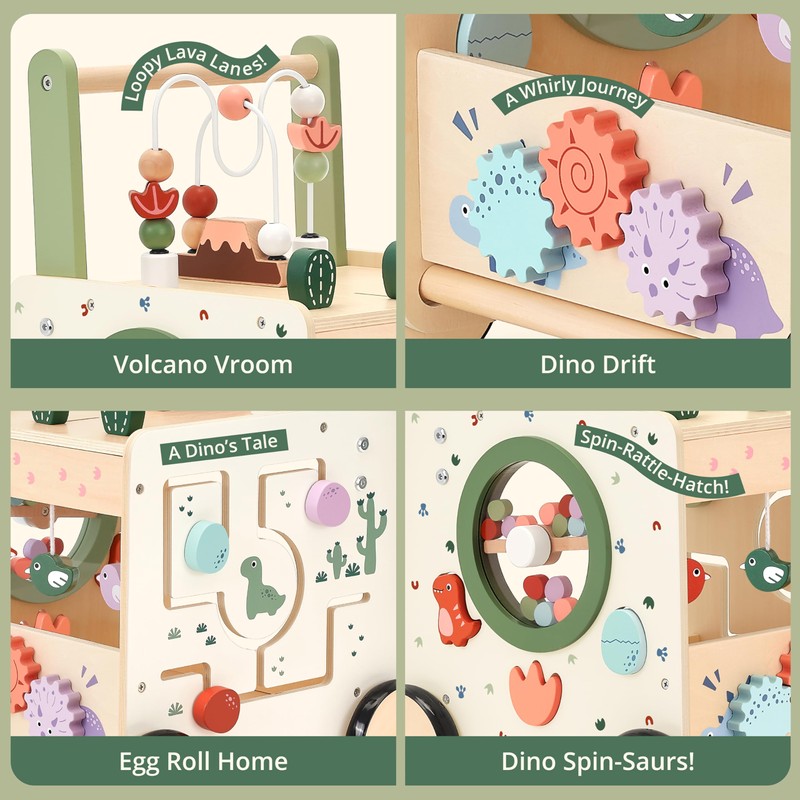 - Dino-Themed Sensory Adventure: Six engaging activities in one push cart—volcano bead maze, dino egg slider, Jurassic cactus pegs, roaring gear spinner, claw-string grabber, and fossil shape sorter—spark curiosity and boost fine motor skills for toddlers 12m+