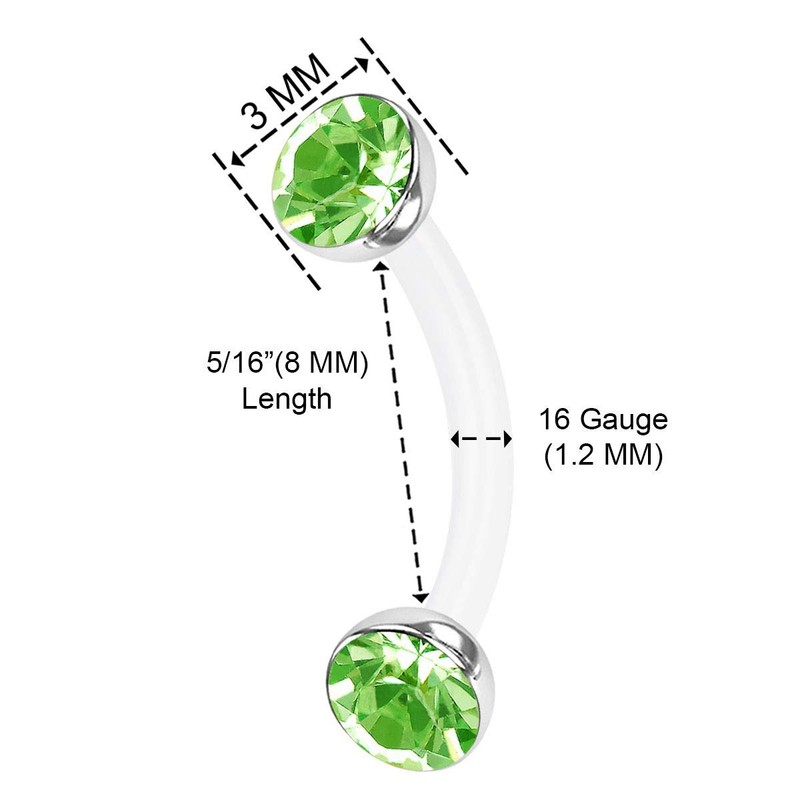 - Package includes 2 pieces. 1.2 mm (16 g) 8 mm (5/16 inch) clear, flexible acrylic banana piercing, 3 mm peridot crystal hemisphere.