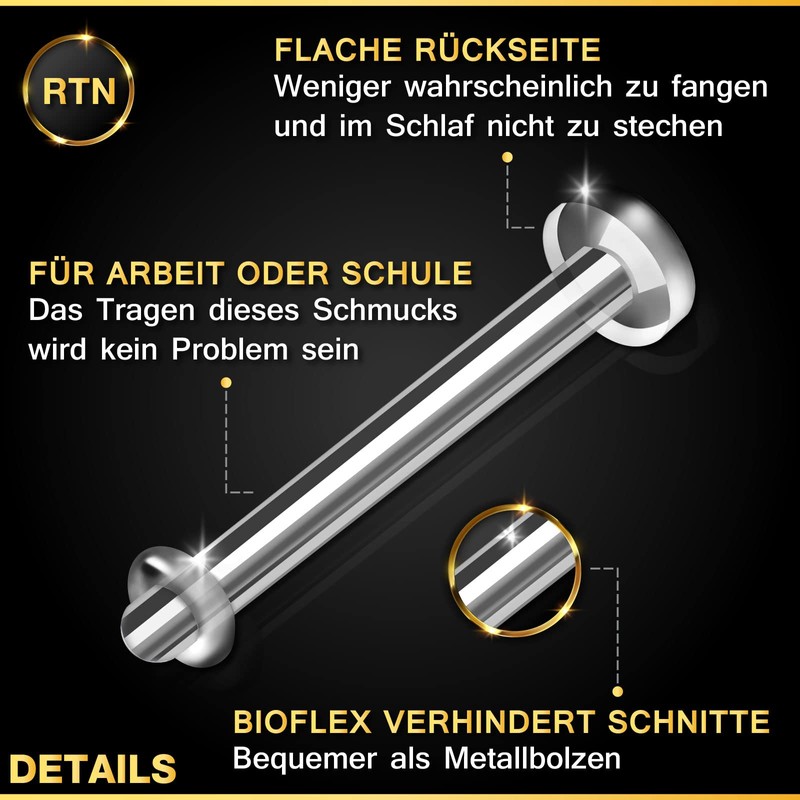 - Bioflex prevents cuts and offers more comfort than metal, making it the perfect material for piercing lip. Product features: labret ring, piercing lip 1 2, upper lip piercing 8 mm, bioflex Madonna piercing.